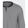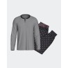 Pyjama long cardé 100% Coton. Le t- shirt à manches longues est uni et a une patte de boutonnage à deux boutons, tandis que le pantalon avec poignets a un imprimé micro-motif, une taille élastiquée et des poches latérales. Fabriqué au Portugal.