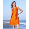 Cette robe sans manches, boutonnée sur le devant et dotée d'un décolleté en V, confectionnée en batiste légère et respirante, elle arbore un subtil détail de plumes qui lui confère une touche de sophistication. L'encolure est ornée de plis, créant un look unique et élégant. Cette robe est le complément idéal de vos maillots de bain préférés et vous accompagnera lors de vos promenades estivales, offrant une option fraîche et stylée pour la plage ou la piscine.