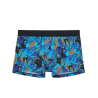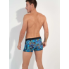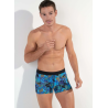 Le boxer HANOÏ est un boxer pour hommes en polyamide élasthanne. Son imprimé est très lumineux et présente un beau jeu de contrastes entre de larges feuilles de végétaux exotiques bleu azur, bleu marine et rouge sur fond de camouflage noir, gris et turquoise.